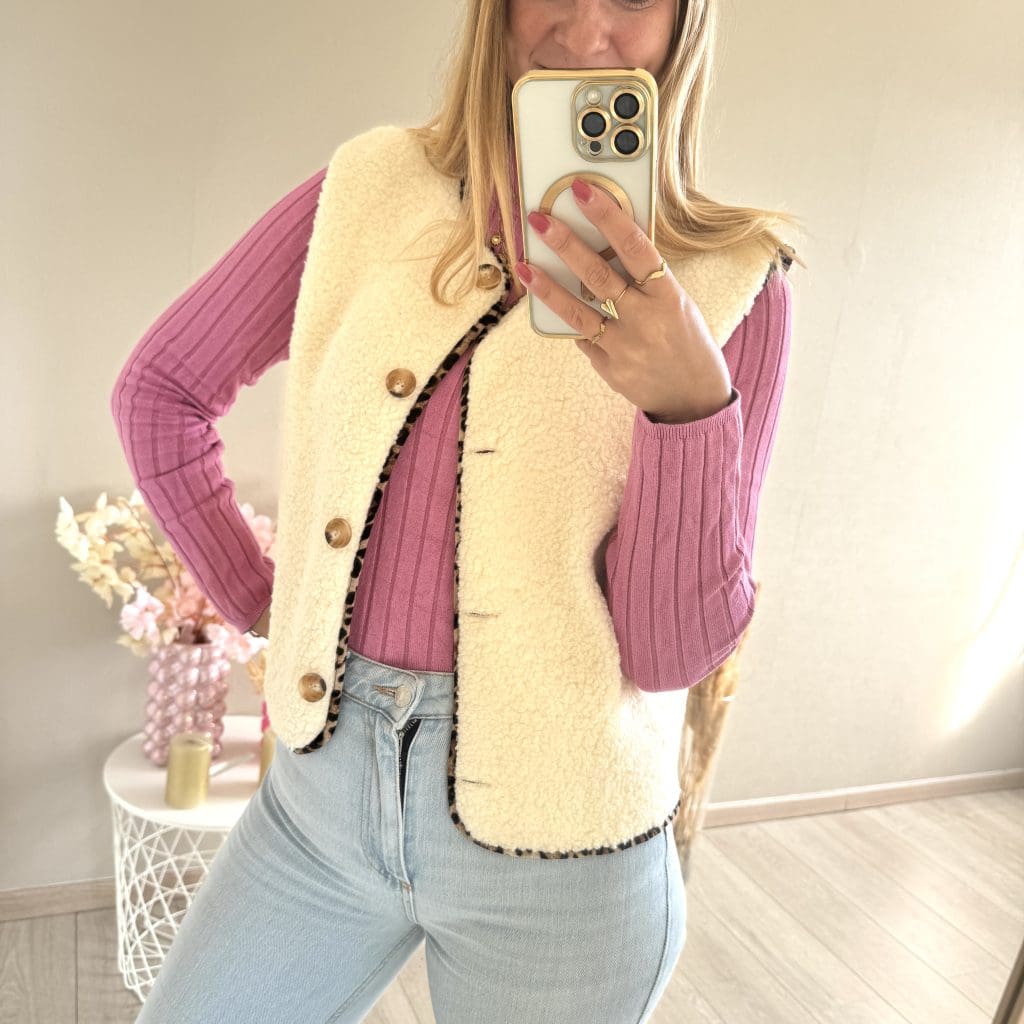Ja, dit is mijn favoriet al gelijk, haha. Het is geen vest maar een super cute teddy giletje met panterprint details. Hoe leuk is die?! We hebben deze in verschillen beige/bruin tinten en een zwarte variant. Echt zo leuk om mee te combineren met je outfit. De binnenkant is ook lekker zacht, een soort suede stofje. Love it. Deze giletjes zijn één maat en te dragen van S t/m L.