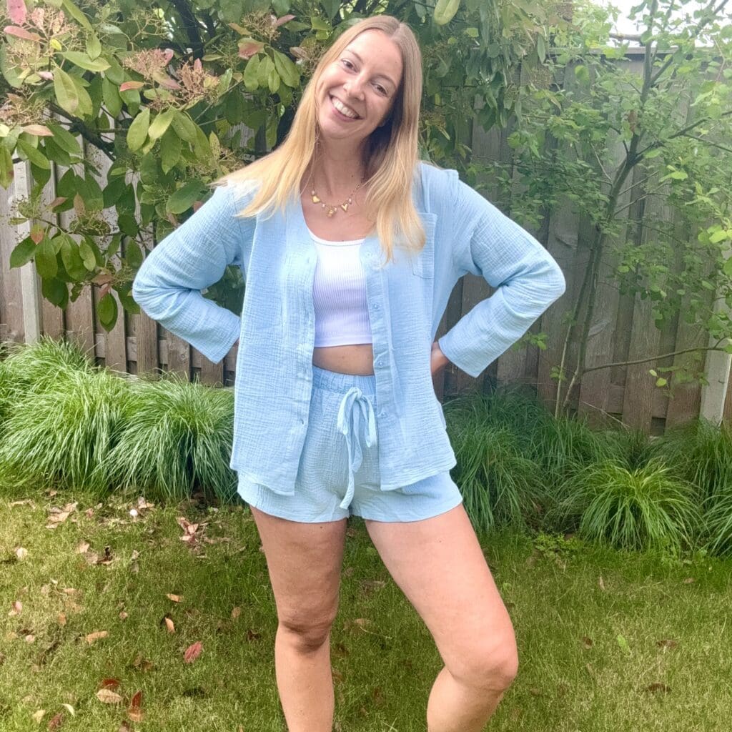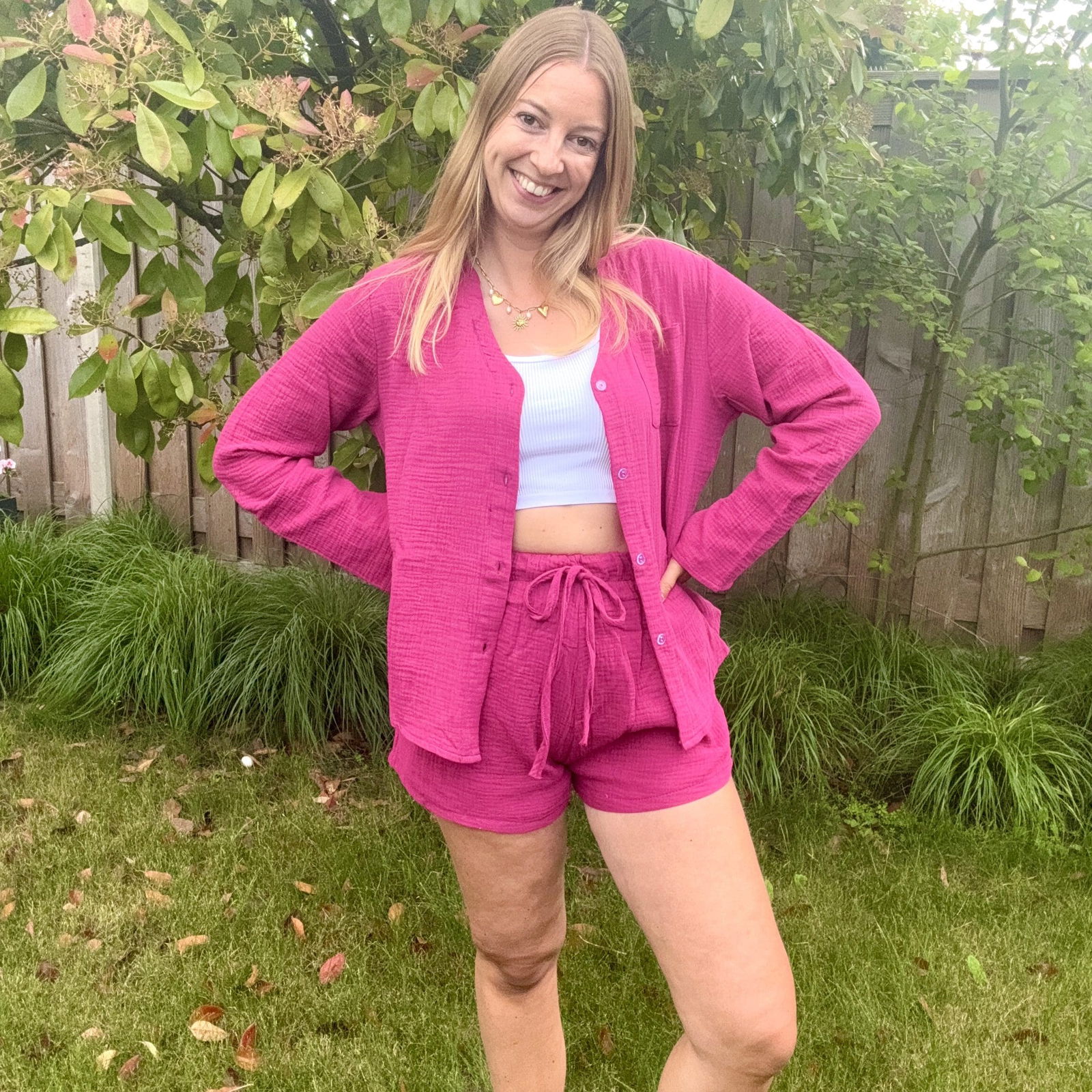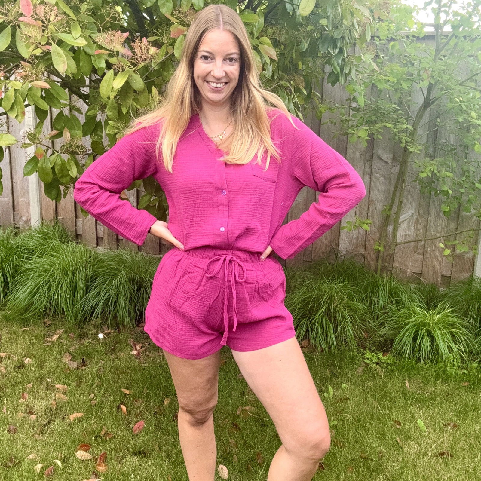 Een van de setjes bestaat uit een kort broekje en een blouse met lange mouwen. Heerlijk van een luchtige stof en in leuke kleurtjes. Een soort fuchsia kleur en een baby blauwe kleur. Ik heb zelf de fuchsia kleur en vind deze echt prachtig.
