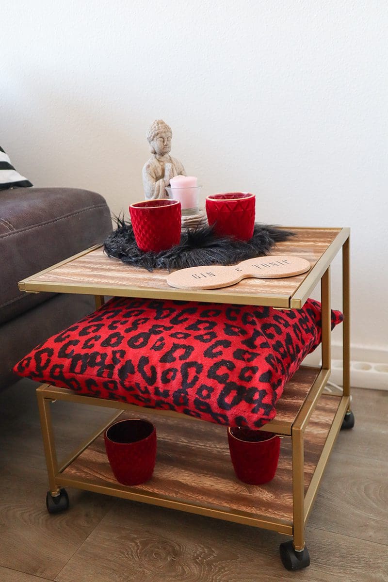 Thijs heeft laatst bij de Action een erg leuk decoratie tafeltje gekocht. Het idee was om tijdschriften hierop kwijt te kunnen. Die liggen nu in een la. Dus heb ik er wat gezelligs van gemaakt, haha. En je ziet ook nog mijn favoriete kussen die op de bank ligt: Ik zit.