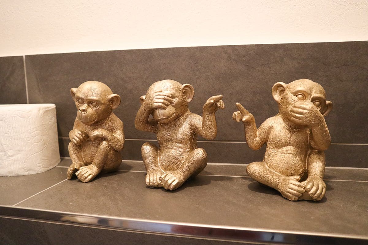 En dan wil ik je nog een leuk detail laten zien. Onze wc is ook erg gezellig met onze horen, zien & zwijgen aapjes! Buiten ben ik bezig met decoreren. Leuke plantjes aan het balkon. Of bakken die aan het balkon kunnen hangen met bloemen erin. Wat mij heel erg chill lijkt is een chillstoel of een hangmat + standaard op het balkon. Eens kijken of zoiets mogelijk is. Moet vast kunnen!