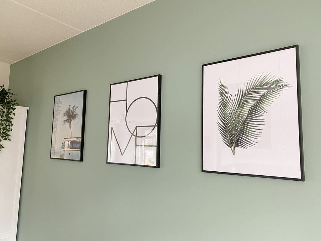 Op de muren wilde ik ook graag wat leuke dingen hangen. Niet al te veel maar toch is het meer geworden dan ik eerst dacht, haha. Ik zie zo veel toffe posters en schilderijtjes. Te weinig muren zal ik maar zeggen. Zo vind ik een canvas foto ook altijd erg leuk aan de muren. Misschien dat bewaren voor boven. Beneden heb ik gekozen voor drie posters die bij de groene kleur passen. Een groen blad, Home en een palmboom met busje. Dit vind ik erg leuk bij de groene muur.
