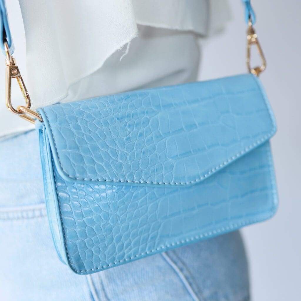 Dan de laatste tas van mijn favorieten. Dit blauwe ‘envelop tasje’. Deze kleur is alleen al zoooo mooi. Mocht je geen fan zijn van blauw, deze tas hebben we ook in het grijs. De opvallende band vind ik een leuk detail. Een ideaal klein tasje om mee te nemen tijdens een avondje uit.