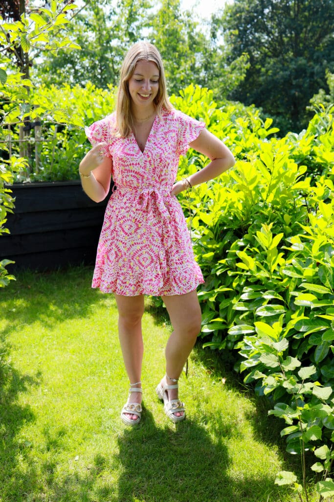 Mijn favoriet is het gekleurde jurkje met print. Het is een grappig printje met ‘gouden flatsen details’. Of hoe noem je die gouden vlekjes op de jurk?! Haha. Het jurkje hebben we in een roze kleur of in een mint groen-achtige kleur.