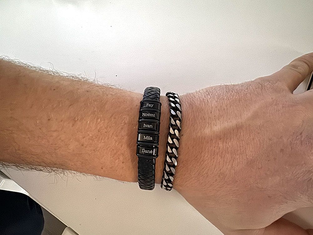 De papa draagt liever armbanden. Op zoek naar heren armband graveren. En zo zag ik een stoere leren armband waarbij ik alle vijf de kindernamen in heb laten graveren. Het zijn een soort ringen die om de armband zitten. Persoonlijke items voor een mooi gezin dacht ik zo. En zo hebben ze hun mooie en dierbare kinderen altijd bij zich.