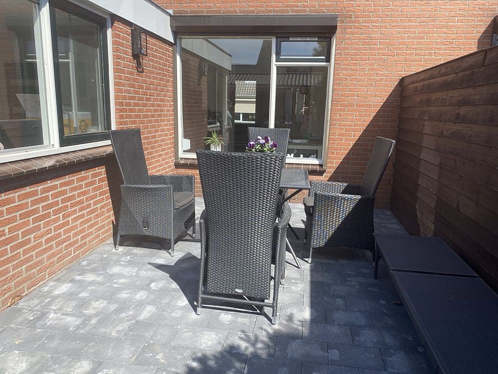 Je kunt hier de hele dag in het zonnetje zitten. Zeker wanneer het nog niet heel warm is, kun je hier al snel zitten. Het tuinsetje staat precies in een hoek tussen de schutting en onze bijkeuken. De wind komt hier nauwelijks. Vandaar dat je er al snel lekker kunt zitten.