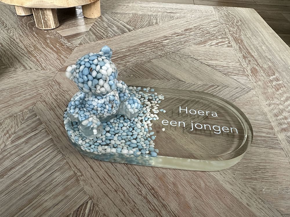 Als laatste matchende item wil ik jullie onze geboorte cadeautjes nog laten zien. We hebben een plateau voor de geboorte van een jongen of meisje. Een bijpassend beertje erbij en dit is dan toch tè cute?!