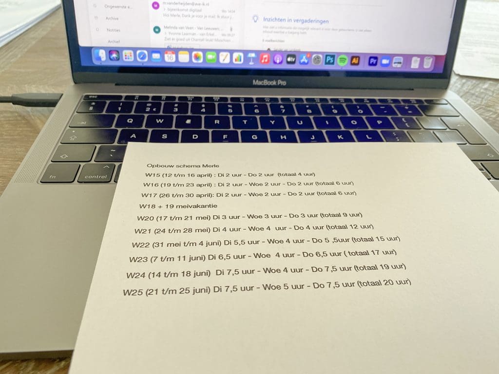 En ik wil ook dan langzaam steeds wat meer in de klas aanwezig zijn. Zo wen ik weer aan die prikkels. Dat ik de dag nadat ik gewerkt hebt, moe ben is te verwachten. Maar dat moet langzaam ook minder worden.