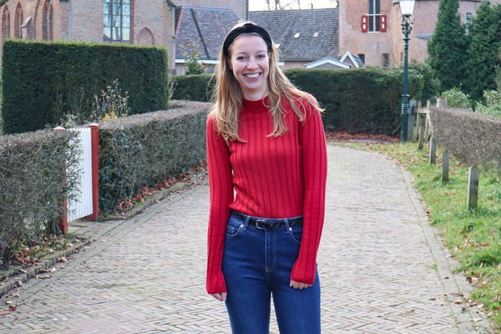 die rode trui en de outfit staat goed. Het fleurt je helemaal op.