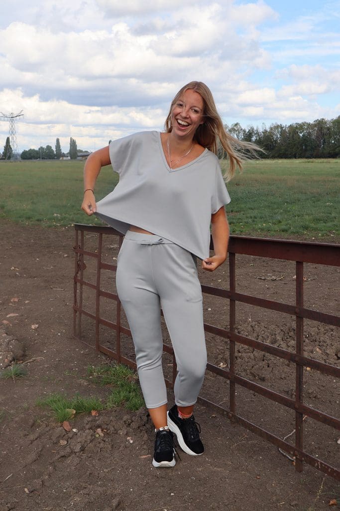 De broek zit helemaal top. Niet te strak. Had alleen niet goed gezien dat het een beetje een 7/8 broek is. Maar dat is oké. Het t-shirt is echt huge! Jeetje die is echt wel groot. Had ik niet helemaal verwacht. Hij zit wel lekker hoor. Dat zeker. Het stofje is sowieso wel fijn. Maar wel echt groot het shirt. Maar ach: voor ’s avonds op de bank. Prima te doen.