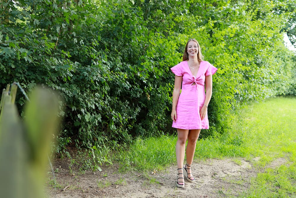 Dan door naar een super vrolijk en kleurrijk item! Een linnen roze jurkje. Ik dacht eerst: deze staat mij niet zo denk ik (qua model) maar in tegendeel. Dit item heeft mij het meeste verrast! De kleur alleen al is super leuk ( je kunt het al raden: maar deze jurk is er ook in andere kleuren). Maar het modelletje vind ik ook erg leuk. Aan de voorkant moet je de jurk knopen bij je boobies. Ik maak de strik een beetje groot zodat je je bh ook niet ziet. Linnen is een erg fijne en luchtige stof moet ik zeggen. Wel een beetje kreuk gevaarlijk. Dus strijken is bij dit jurkje geen overbodige luxe. Een maat 36 zit mij prima.