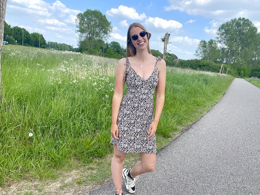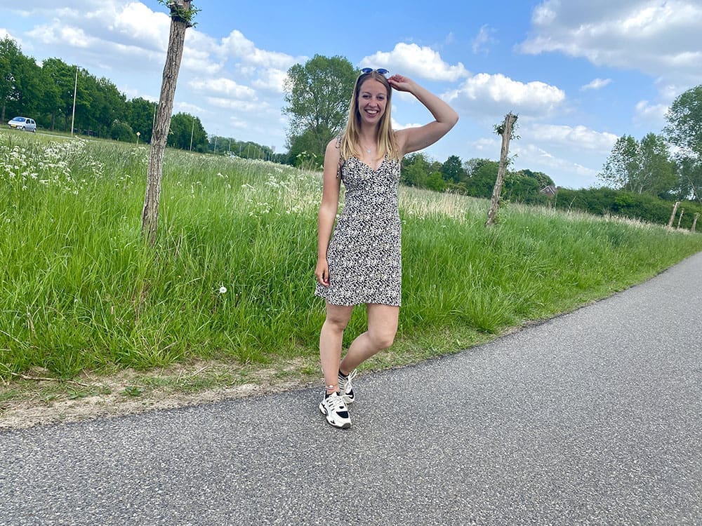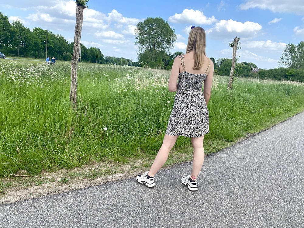 Dit is echt een zomers jurkje. De spaghetti bandjes kun je zelf strikken en dus ook verstellen op deze manier. Echt handig vind ik. De heb de strikjes namelijk best strak geknoopt. Hierdoor viel de voorkant wat hoger. Want zoals je ziet heeft het jurkje een best decolleté…..