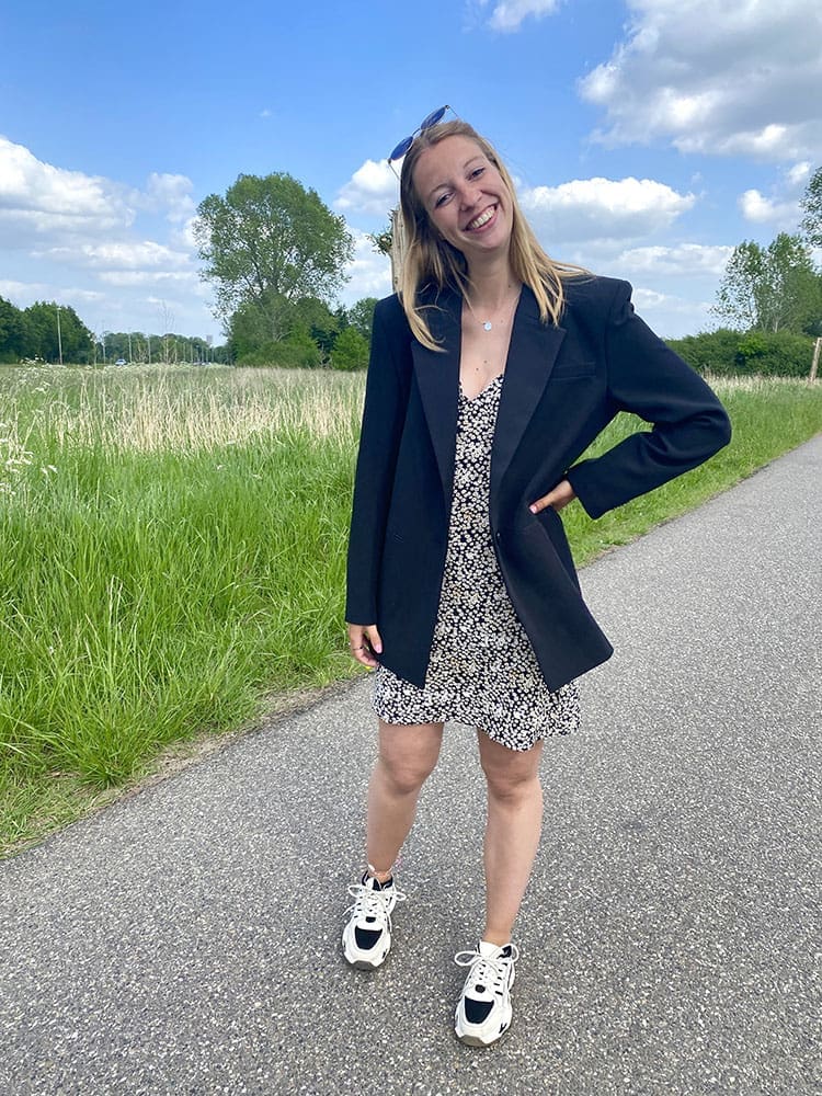 Het is een fijn zomers jurkje om met de warme dagen te dragen met een slippertje. Mocht het frisser worden in de avonden dan kan hier heel leuk een jasje overheen. Of zoals je ziet: een oversized blazer.