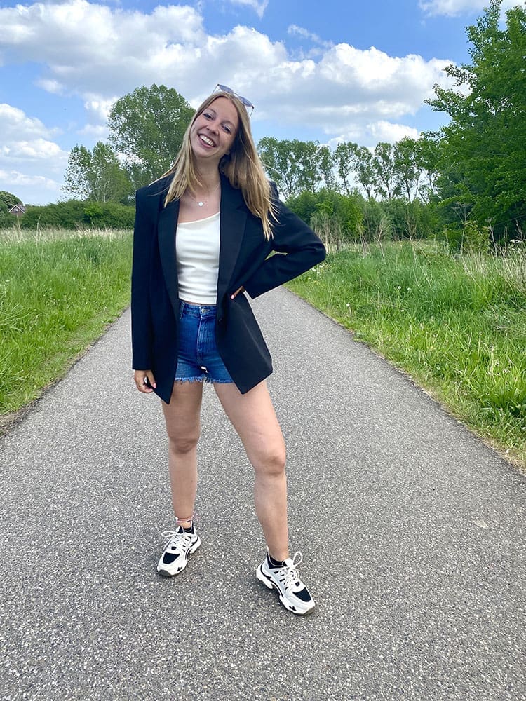 Onder de blazer draag ik een witte top van NA-KD die schuin loopt. Een heel erg grappig en leuk detail. De bandjes zijn heel dun en zijn niet te verstellen of iets. De top sluit mooi aan en zit zo fijn. De stof voelt wat dikker en fijn aan. Ik heb de top in een off white kleur en deze schijnt niet zo heel erg door. Hoe fijn?!