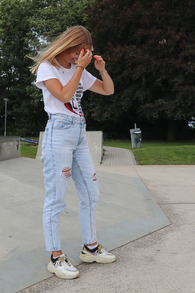 Toch kocht ik een destroyed mom jeans bij de Primark. Vandaar ook deze Primark outfit. Zo’n destroyed mom jeans vind ik heel erg leuk. Maar ik gok dat dit een beetje een seizoenstrend is. Daarom wil ik niet te veel geld uitgeven aan zo’n broek. Ik heb een tijd gehad dat ik met gaten in mijn broeken rond liep. Toen al die broeken weggedaan en tadaa: nu heb ik er weer eentje.