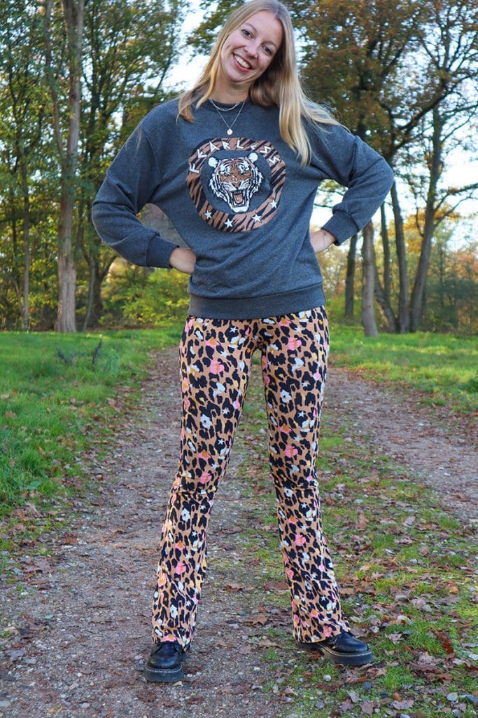 Dit soort sweaters staan ideaal op flared pants. En daar heb ik er veel van! Maar ook op een skinny jeans of een mom jeans vind ik dit soort sweaters tof staan. Op mijn panterprint flared pants staat deze trui helemaal top. Dit vind ik echt een top combinatie. De kleuren, de print, eigenlijk alles klopt, haha.