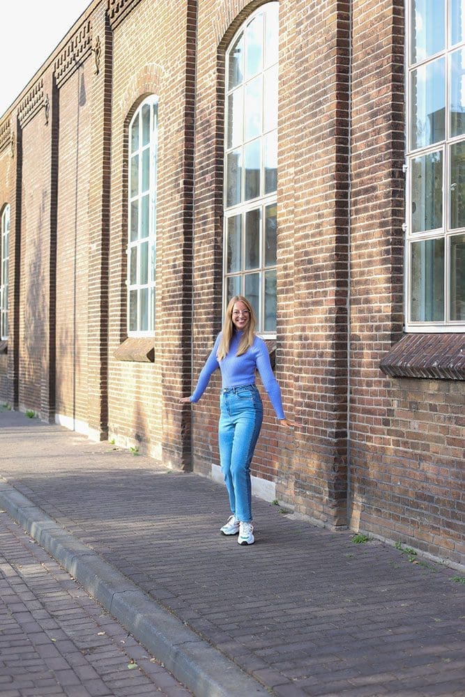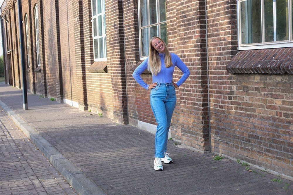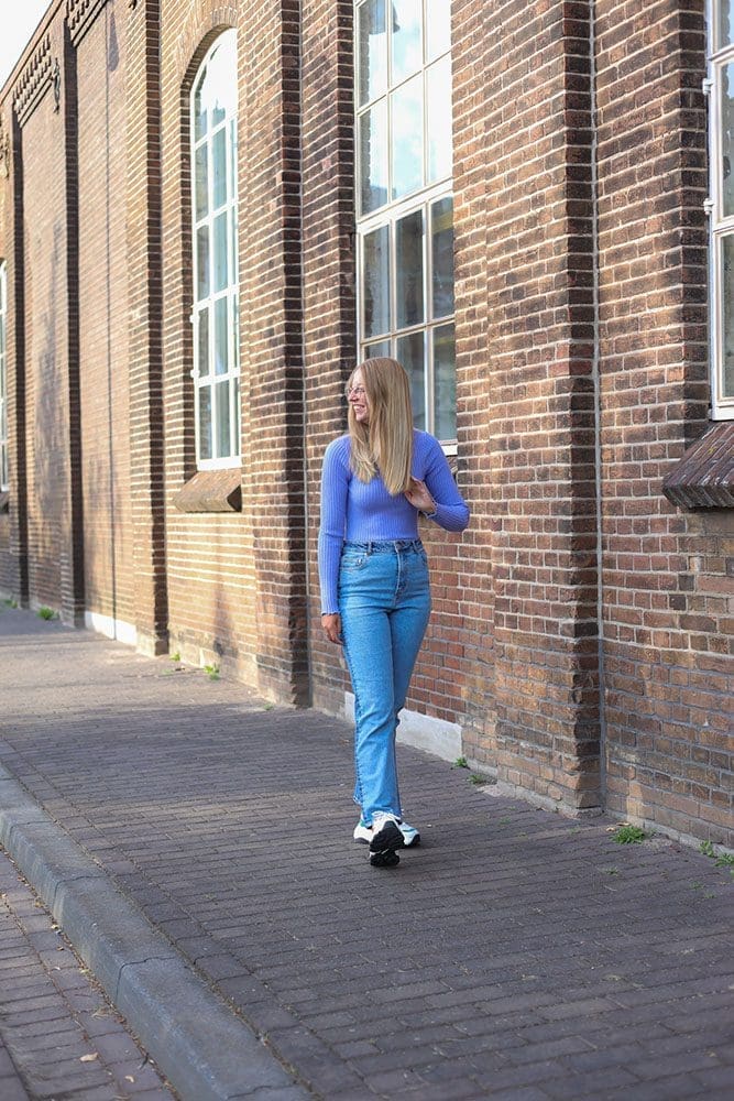 Onder alle truien die voorbij gaan komen, draag ik een super toffe jeans! Een twee kleuren jeans. De voorkant is van een lichte kleur en de achterkant is een donkere kleur. Ik vind het een super grappig detail. Het is een straight model en deze loopt mooi recht naar beneden. Sneakers eronder en go!