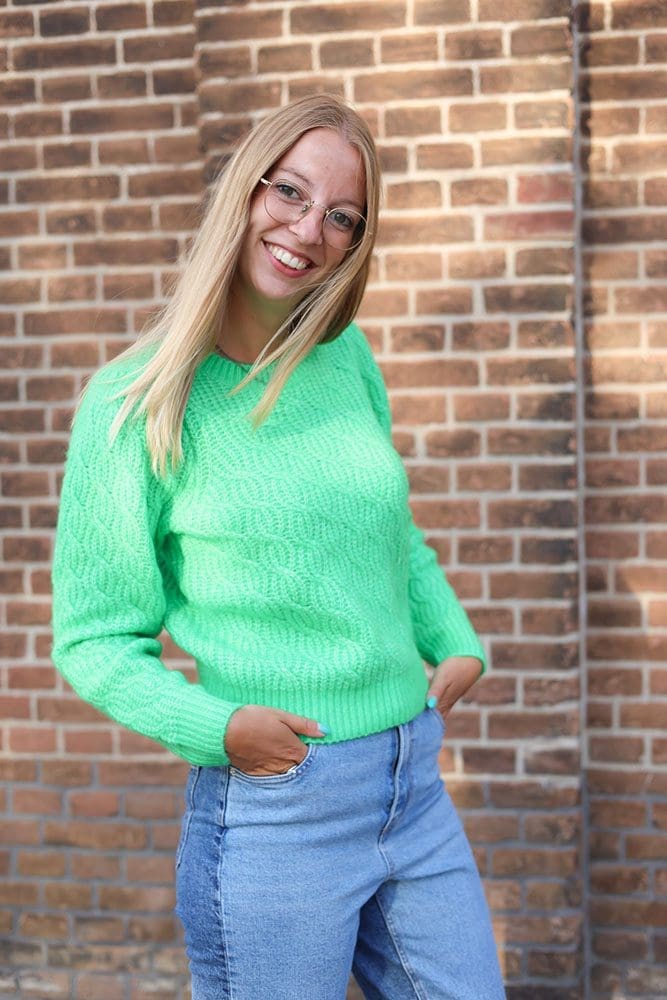 Grooeen, zouden ze bij Lingo roepen. I know: deze trui is echt groen. Daar kun je zeker niet omheen. Ik vind het een heerlijk kleurtje. Lekker fel en vrolijk. Een opvallend item voor straks in het najaar. Mocht je denken: het model van de trui spreekt mij aan maar de kleur niet? Ook deze trui is er in verschillende kleuren. De trui is al wel wat dikker qua stof. Dus echt meer voor de koudere dagen.