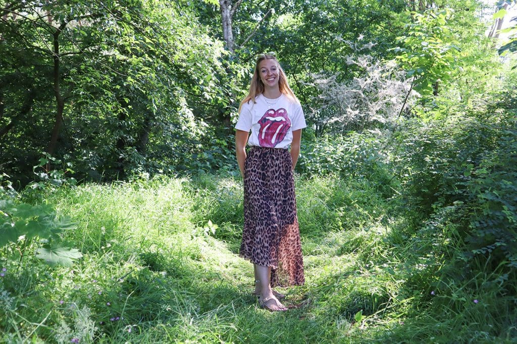 Op de panterprint rok draag ik een oversized t-shirt met The Rolling Stones erop. Oversized shirts draag ik graag met het warme weer. Ze plakken dan niet zo tegen je lijf aan, maar zitten wat wijder. Dat draag veel fijner vind ik. Door het shirt in een rok of broek te doen staat het ook super leuk.