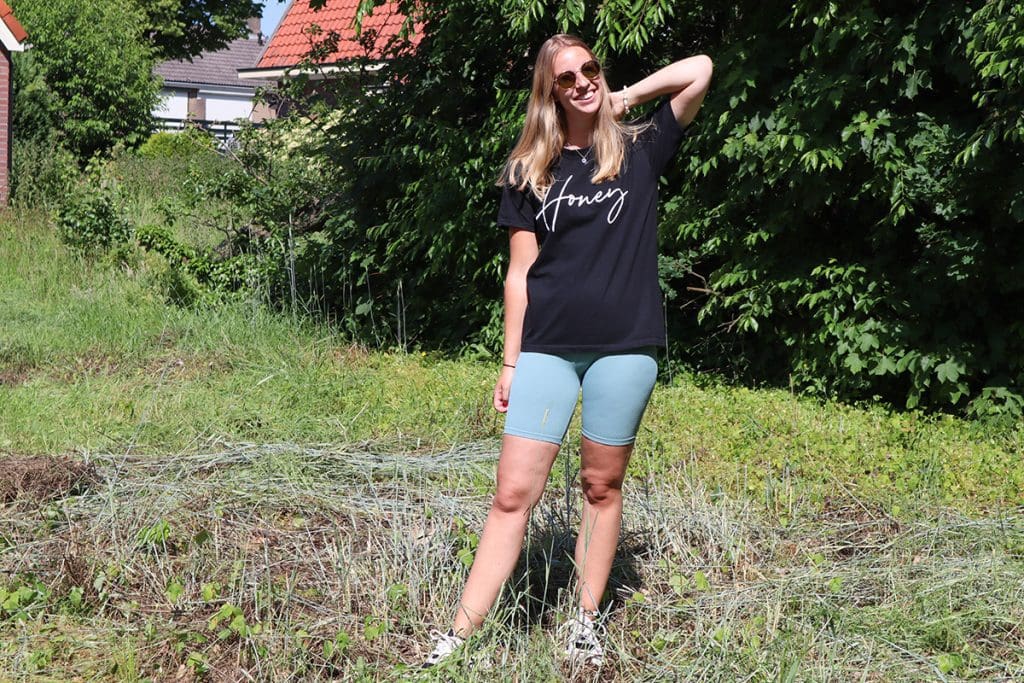 Het oversized t-shirt valt over je kont heen waardoor het fietsbroekje dient als een soort legginkje. Tja, hoe moet je het anders uitleggen, haha. Dit soort looks zou ik wel lekker thuis dragen. Of wanneer je thuis lekker op de bank ligt te chillen. Dan vind ik dit meer passend. Hoewel ik laatst ook heerlijk in zo’n outfit een stuk gewandeld heb. Het fietsbroekje zit zo fijn dat je er goed en makkelijk in kan bewegen. Het is bijna een plaatsvervangend sportbroekje, haha.