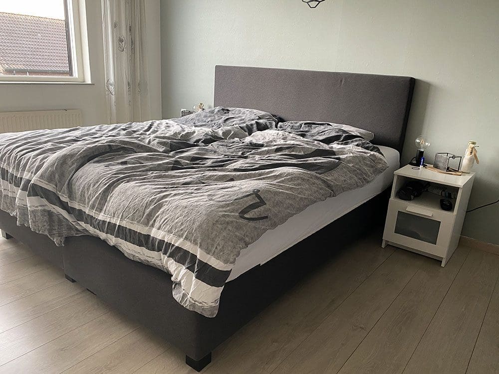 In onze slaapkamer staat ons tweepersoons bed van Club 9. Hier liggen twee losse matrassen op van Club 9. Deze matrassen zijn aangepast aan onze slaaphoudingen, echt heel erg fijn.