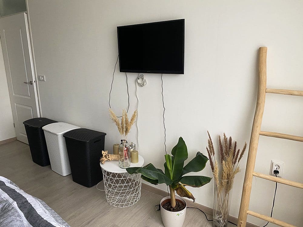 Onze wasmanden staan ook op de slaapkamer en onze leuke houten laddertjes ook waar we kleding overheen kunnen hangen. En dan nog een nieuw item op onze slaapkamer: een tv. Deze komt van mijn schoonzusje af en is een oude tv van Thijs. Prima om deze boven op te hangen.