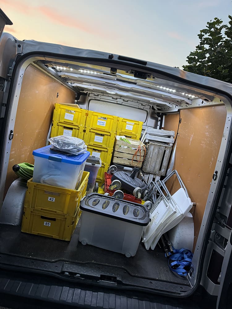 Dan zet ik vaak alle kratten en ander ‘markt materiaal’ klaar. Meestal hangt de kleding in ons kantoor aan het rek. Dit stop ik dan in bakken en pak nog andere items die we nodig hebben (vul eventueel inpakmateriaal aan, mocht dat bijna op zijn).