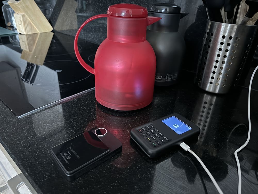 Ik begin met dingen opladen. Dit is iets wat meer tijd kost. Ik laad ons pinapparaat op. Zeker wanneer we twee markten in een weekend hebben, wil ik dat ons pinapparaat helemaal vol is. Niks is zo onhandig dan op de markt staan met een leeg pinapparaat…. Belangrijk dus om deze op te laden.