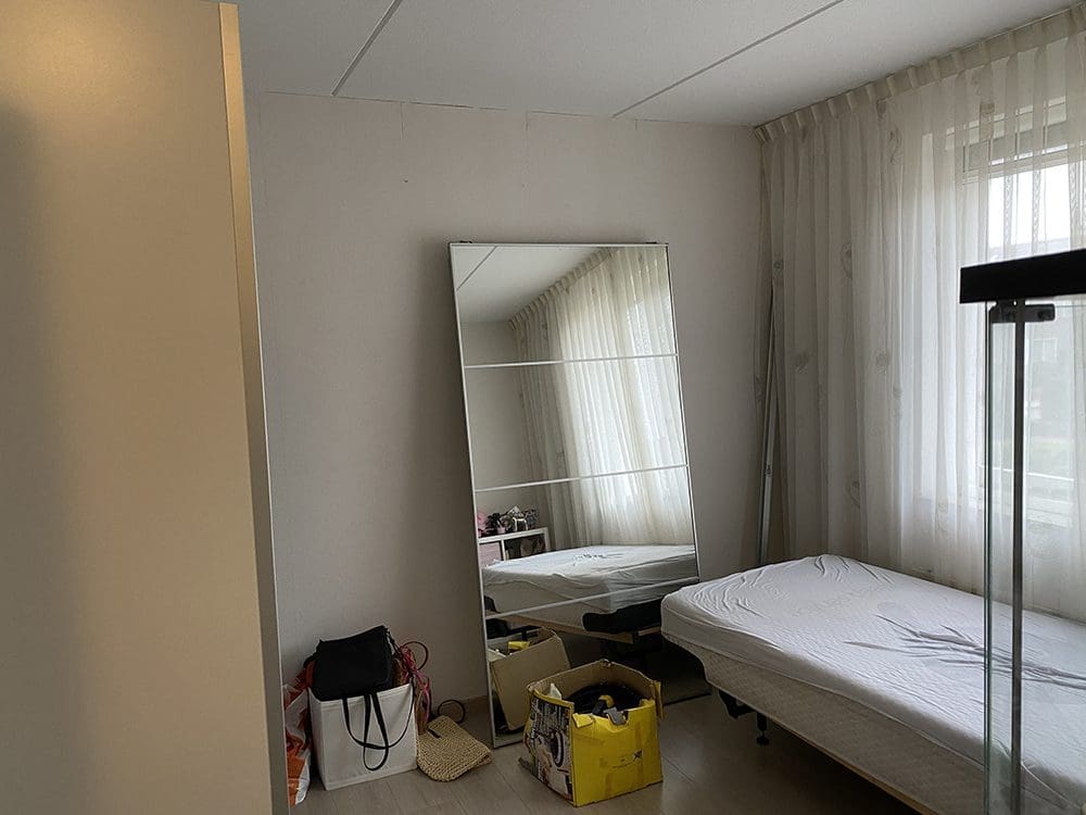 Deze verslepen was niet handig en uit elkaar halen ook niet. Alle kleding heb ik eruit gehaald en we hebben doeken over de kast gedaan. De spiegeldeuren er dus nog niet in. Die zijn het zwaarst en dan was de kast moeilijk naar het midden van de kamer te zetten. Vandaar.