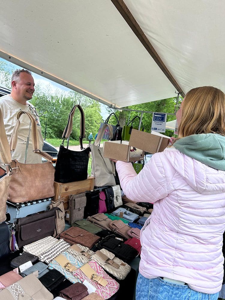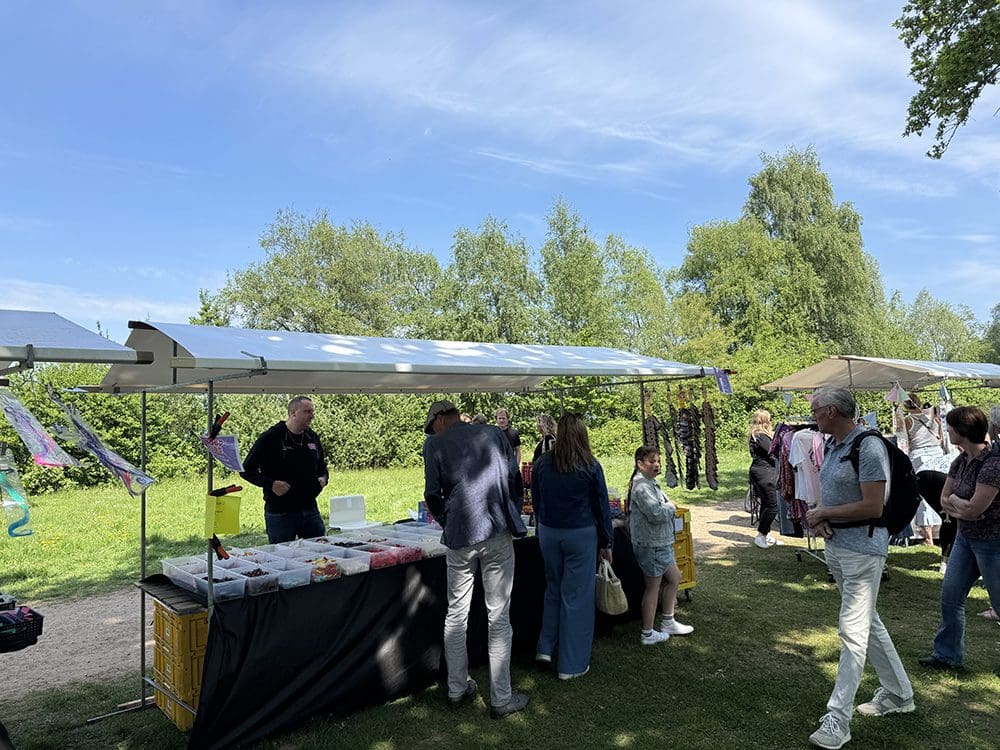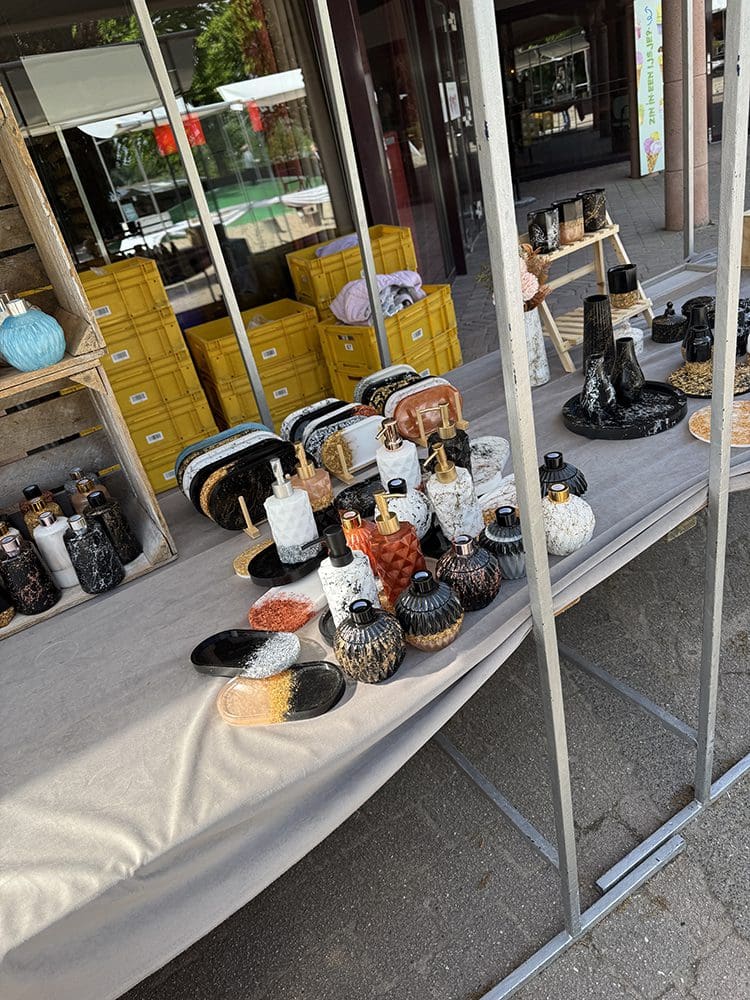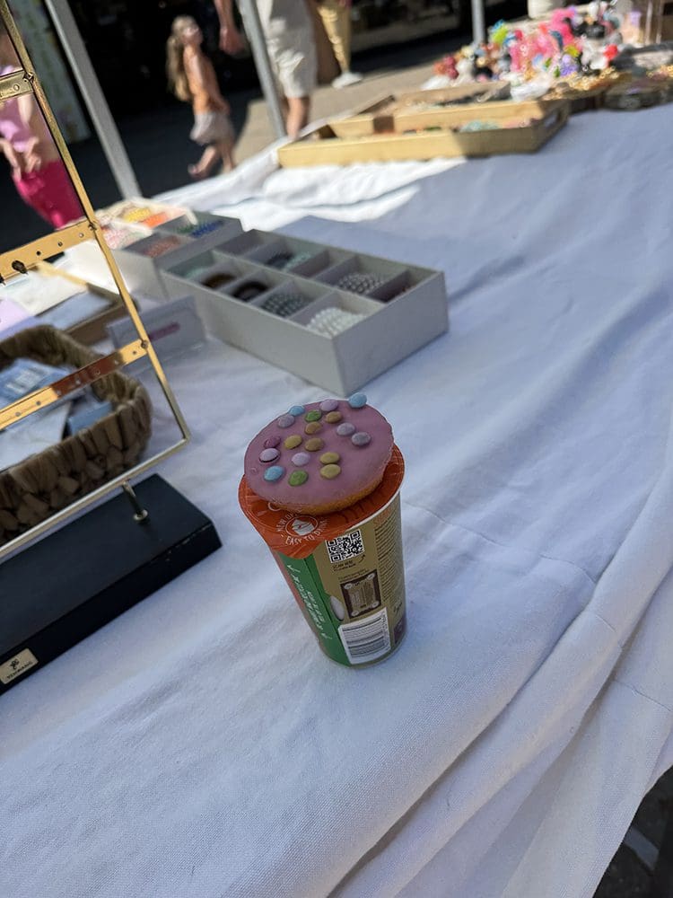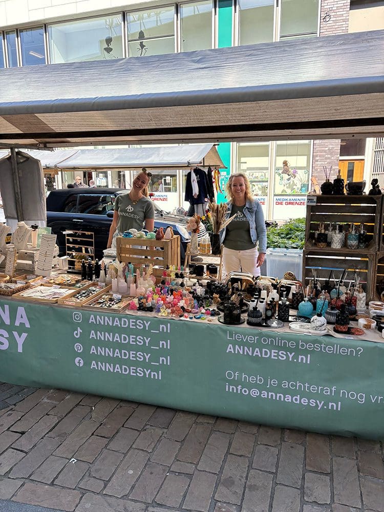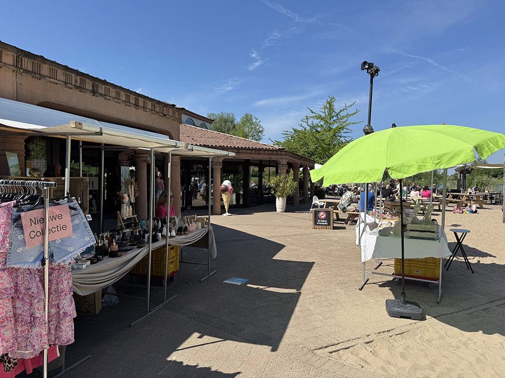 Benden stonden alle andere kraampjes. We waren bang dat mensen niet door hadden dat wij er ook nog stonden. Nou dat viel reuze mee, haha. Het was mooi weer, iedereen op het terras en ik had de kraampjes wat verschoven dat ze meer in het zicht stonden. Ging prima.