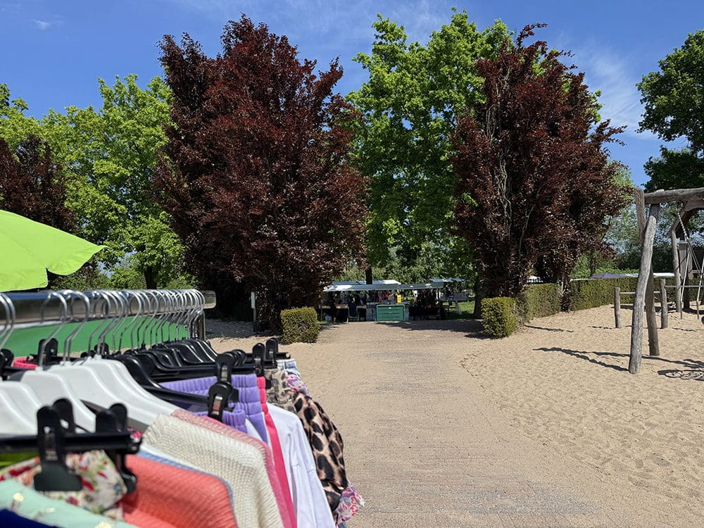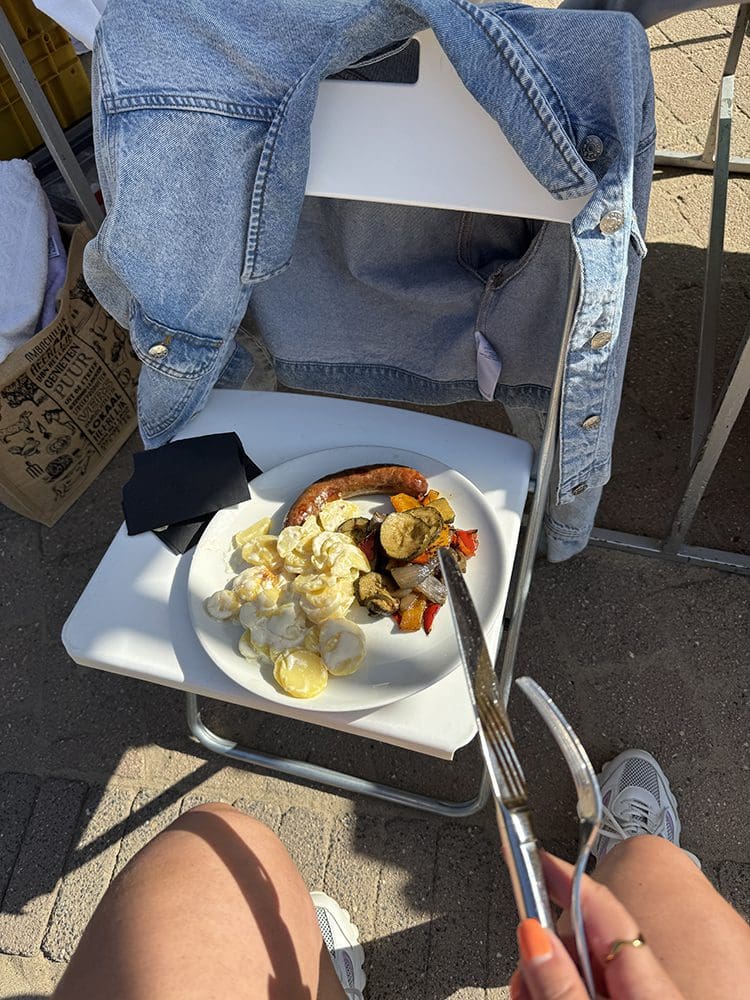 Even lekker lunchen in het zonnetje en gezellig kletsen met de buurvrouw. De kramen stonden gelukkig in de schaduw.