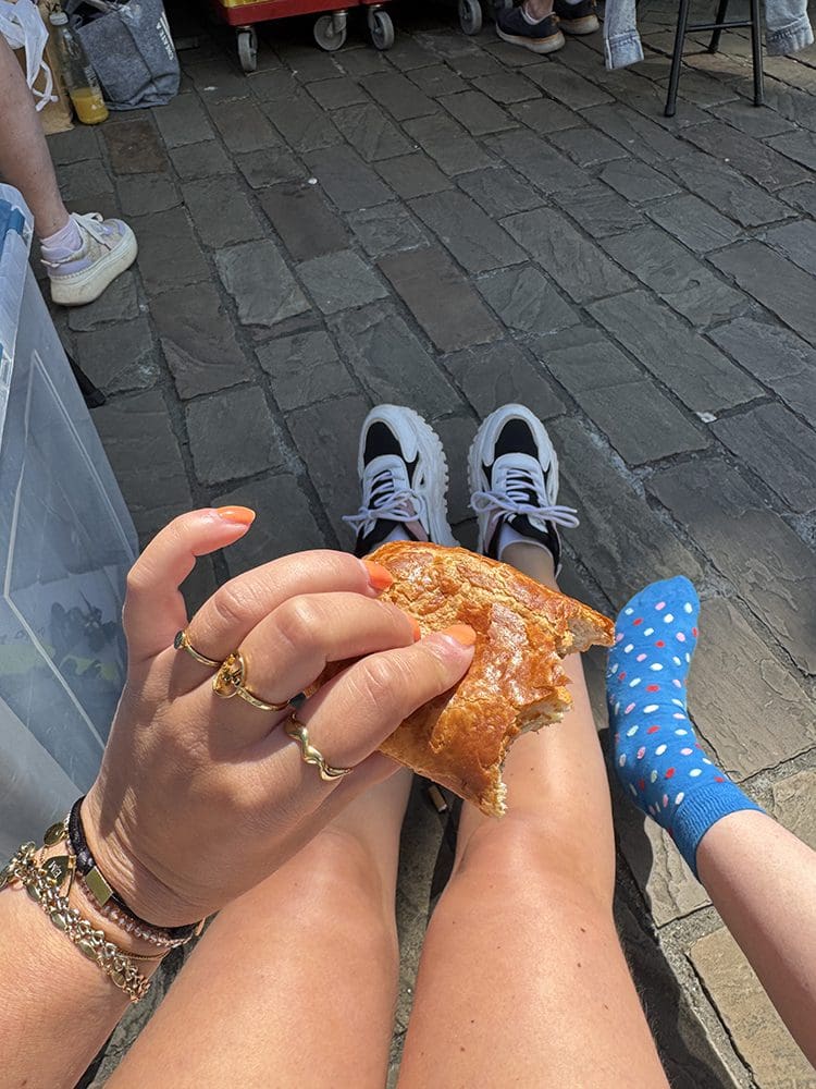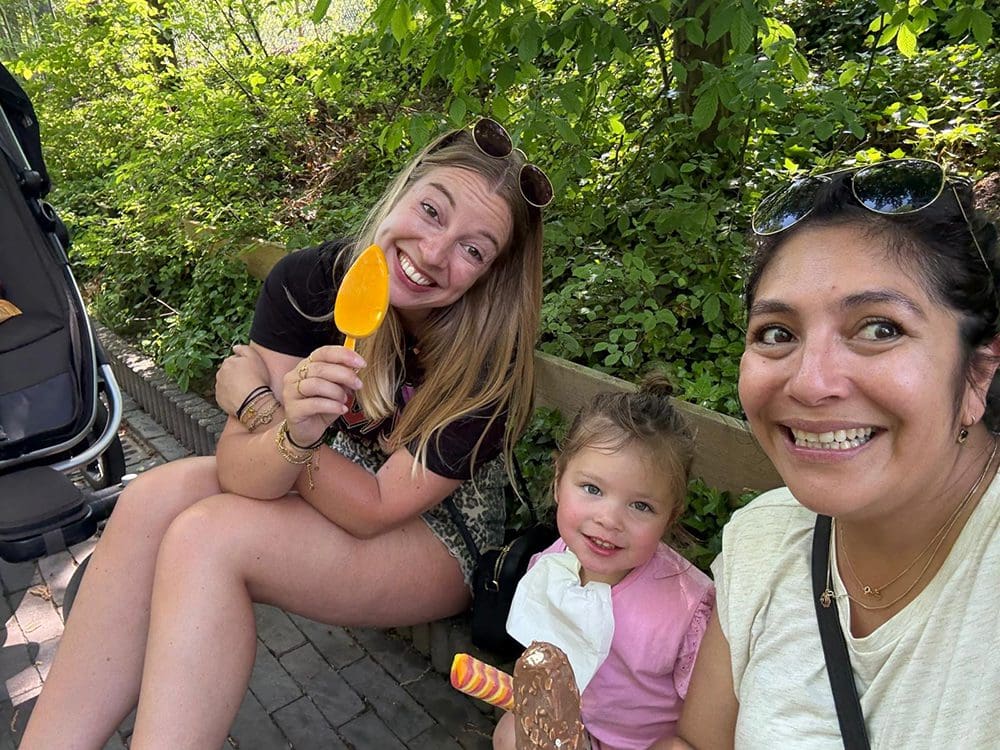 Haha. Het was zo druk in het park. Alle bankjes bezet. We zijn maar op een stoeprandje gaan zitten. Kan prima.