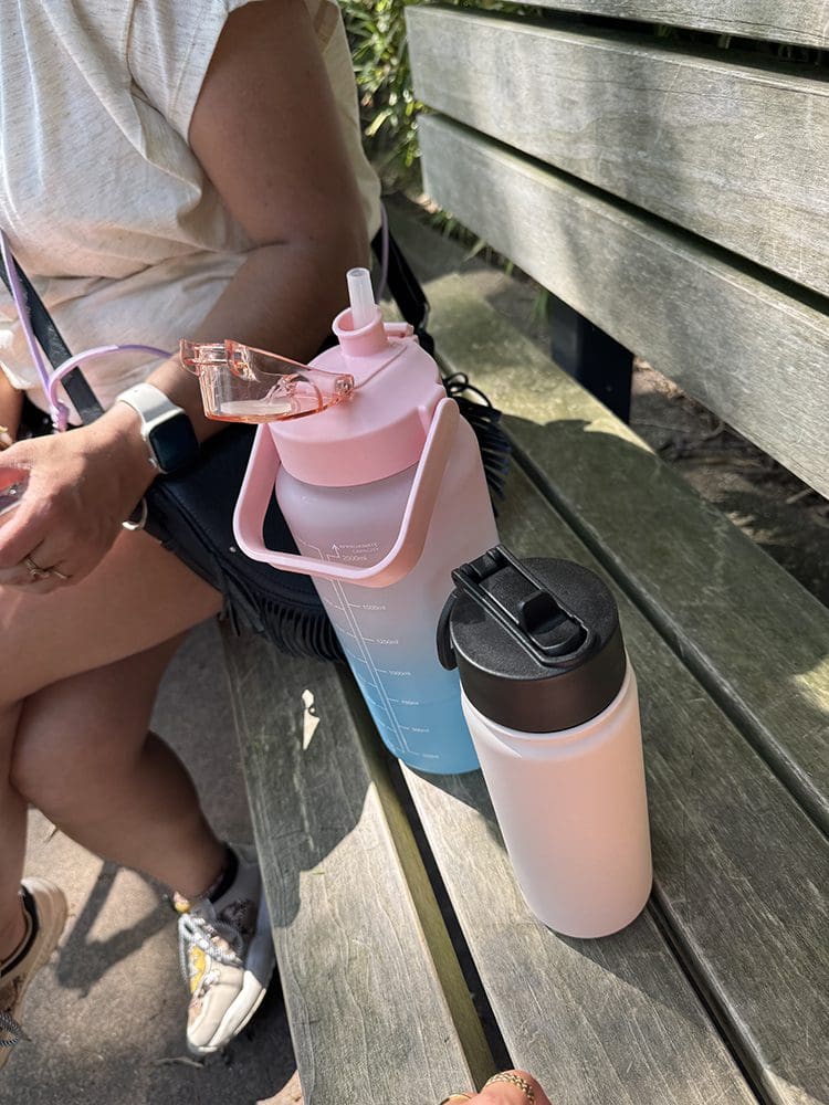 En op een bankje wat gekletst. Goed drinken is belangrijk. Velca met haar grote fles, niet normaal, haha.