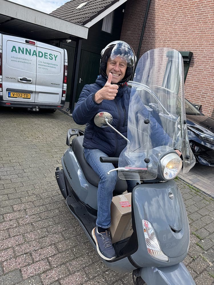En tuurlijk.. Dan komt er net een bestelling binnen. Papa kwam helpen om de juister artikelen uit de kratjes in de auto te pakken. Ik kon niet tillen, niks. Daarna bracht papa het pakketje naar het pakketpunt. Gaat ie hoor op de scooter.
