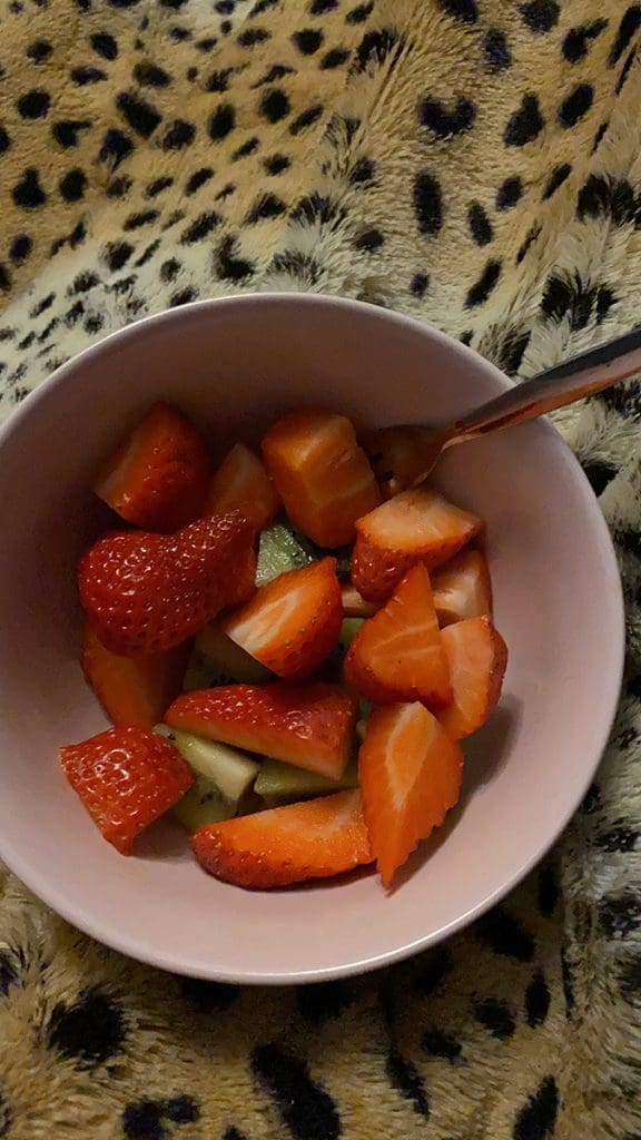 Zondag (28 maart). Ik sliep wat uit en verder lag ik wat op de bank. Thijs maakte een heerlijk fruitbakje en we keken de Verraders.