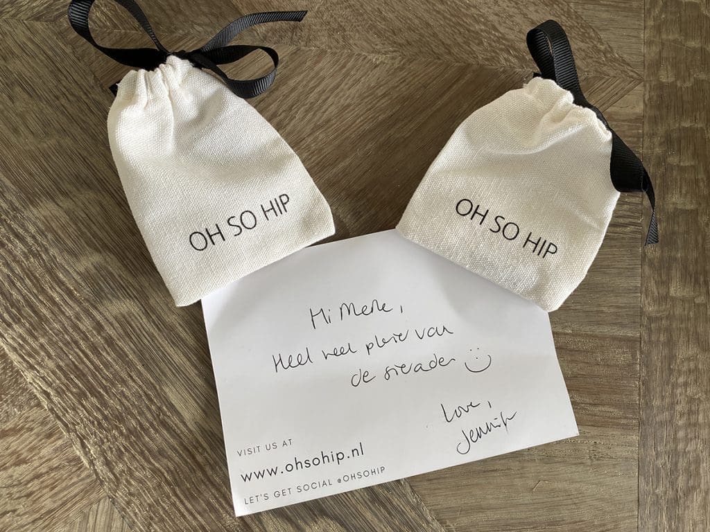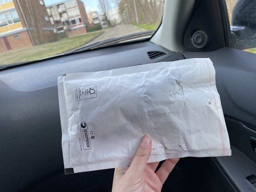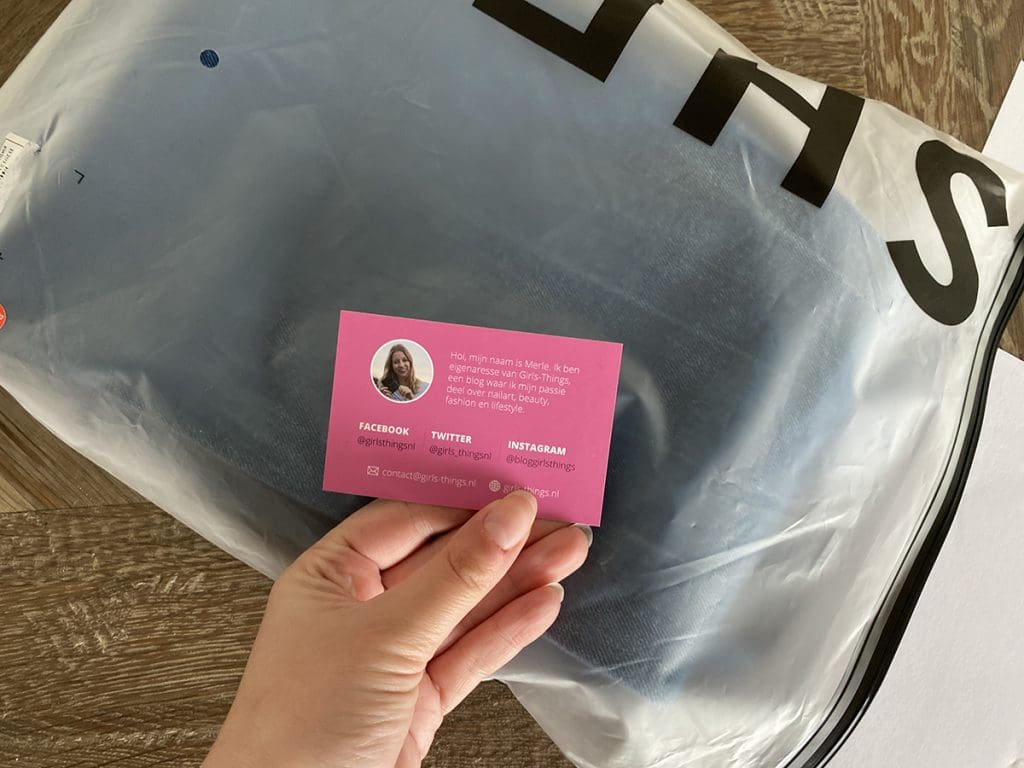 Ik had een broek verkocht via Marktplaats. Deze pakte ik in en deed er een visitekaartje van mij bij, haha. Beetje zelfpromotie kan wel toch.