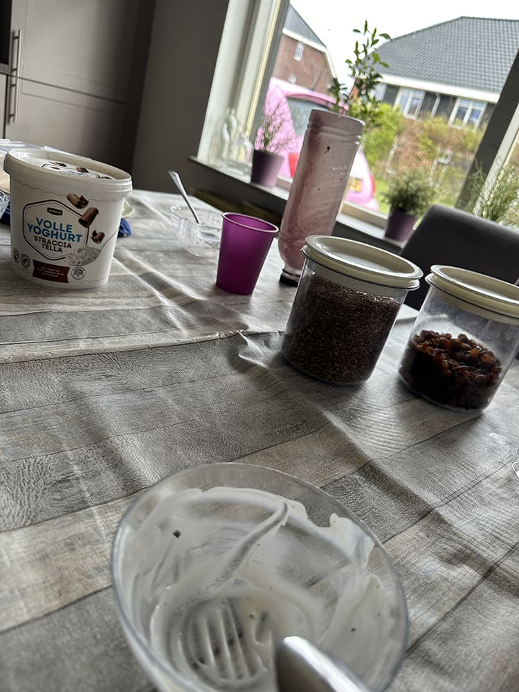 Zondag (21 april). Thijs was midden in de nacht terug gekomen van zijn vakantie. De ochtend hebben we samen koffie gedronken en vertelde hij over de vakantie.