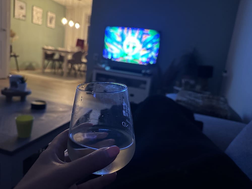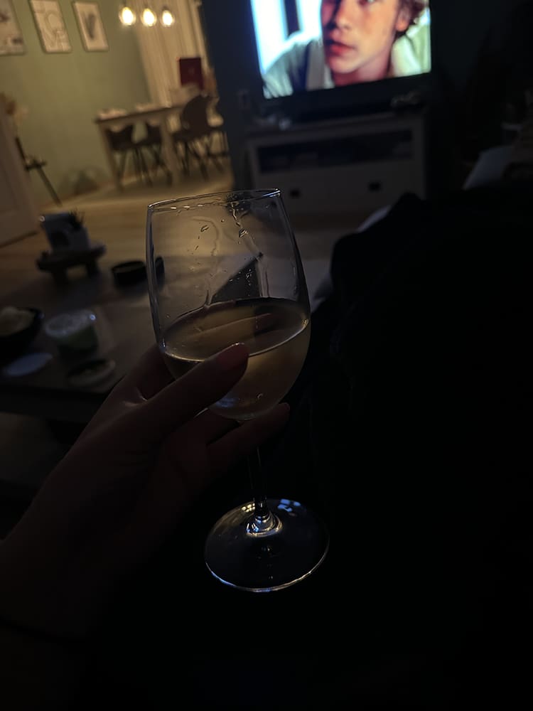 Met een wijntje en een serie op de bank.