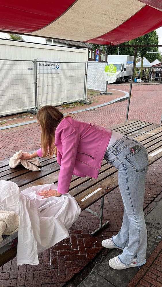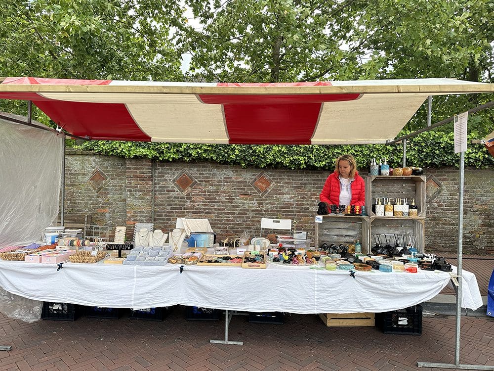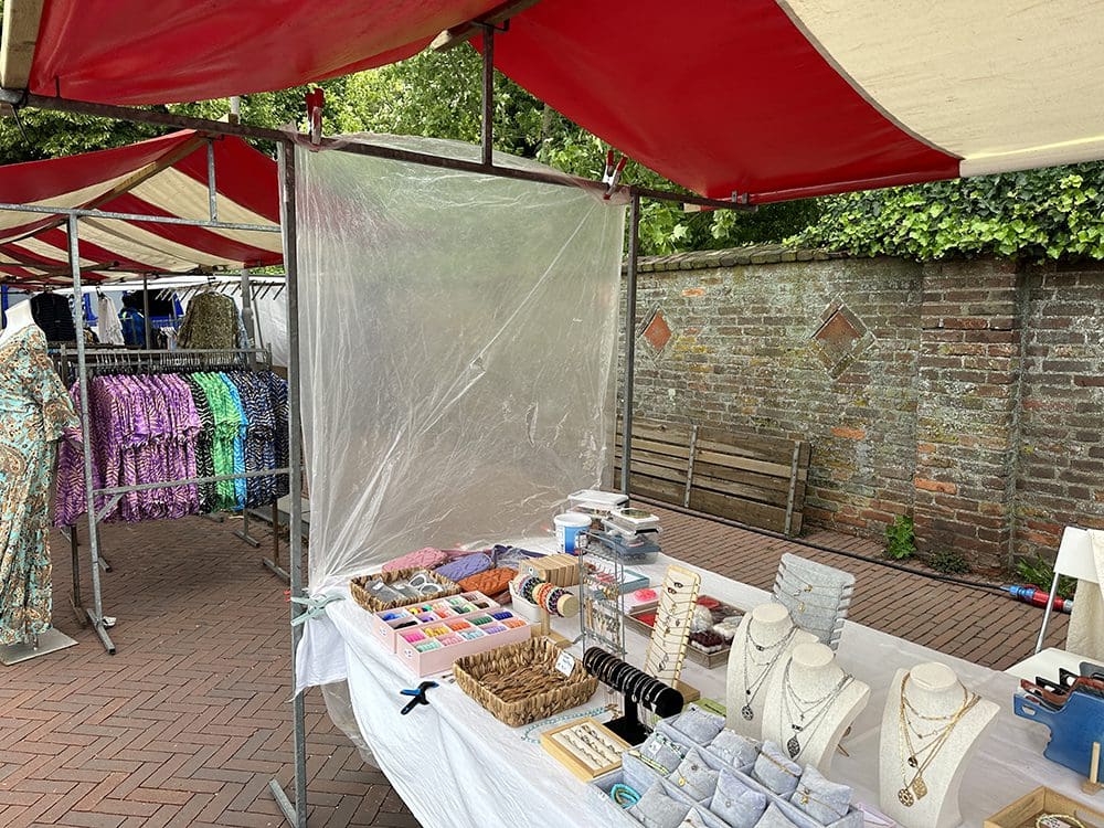 Wel een harde wind. Om wat wind te minderen, hadden we zeil opgehangen. Maar alles klapperde alsnog. De sieraden zijn helaas een paar keer omgevallen. Het zeil zat namelijk ook niet goed vast aan de kraam. Aan de voorkant hebben we dit nog vast kunnen maken met tiewraps. Helaas de achterkant niet en die moesten we geregeld vasthouden. De wind waaide zo onder het zeil en de kraam door.