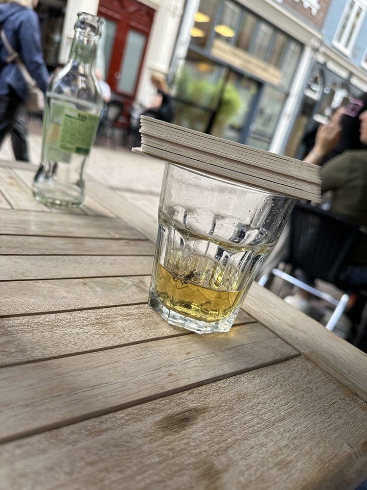 We hadden een wespenvriend die ineens in het drinken van Karlijn vloog. Stom beest. We zeiden al: die is nu boos en wil ontsnappen. Dat laten wij niet gebeuren en hadden allemaal viltjes erop gelegd, haha.