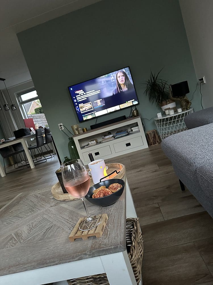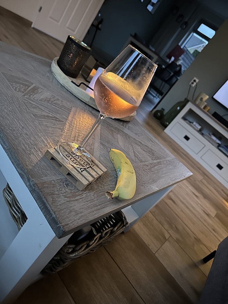 Eenmaal thuis plofte ik op de bank met een serie, een rosé en een banaan. Wat een top combo.