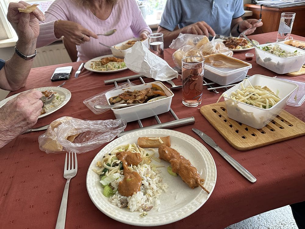 Mama was bijna de hele dag bij opa en oma in huis alles neerzetten en zorgen dat alles goed staat voor opa. Ze belden papa en mij op of we zin hadden in Chinees. Opa wilde met ons allemaal Chinees eten. Dan doen we dat!