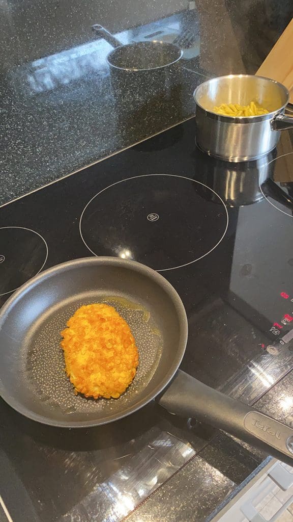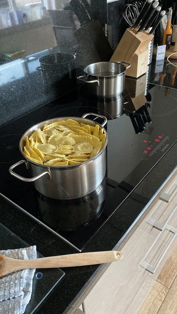 Aan de kook: pasta. Rianne bleef gezellig eten.
