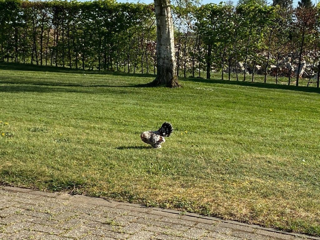 We aten lekker buiten en zagen ineens dat de kippen los liepen. Hok stond open, haha.