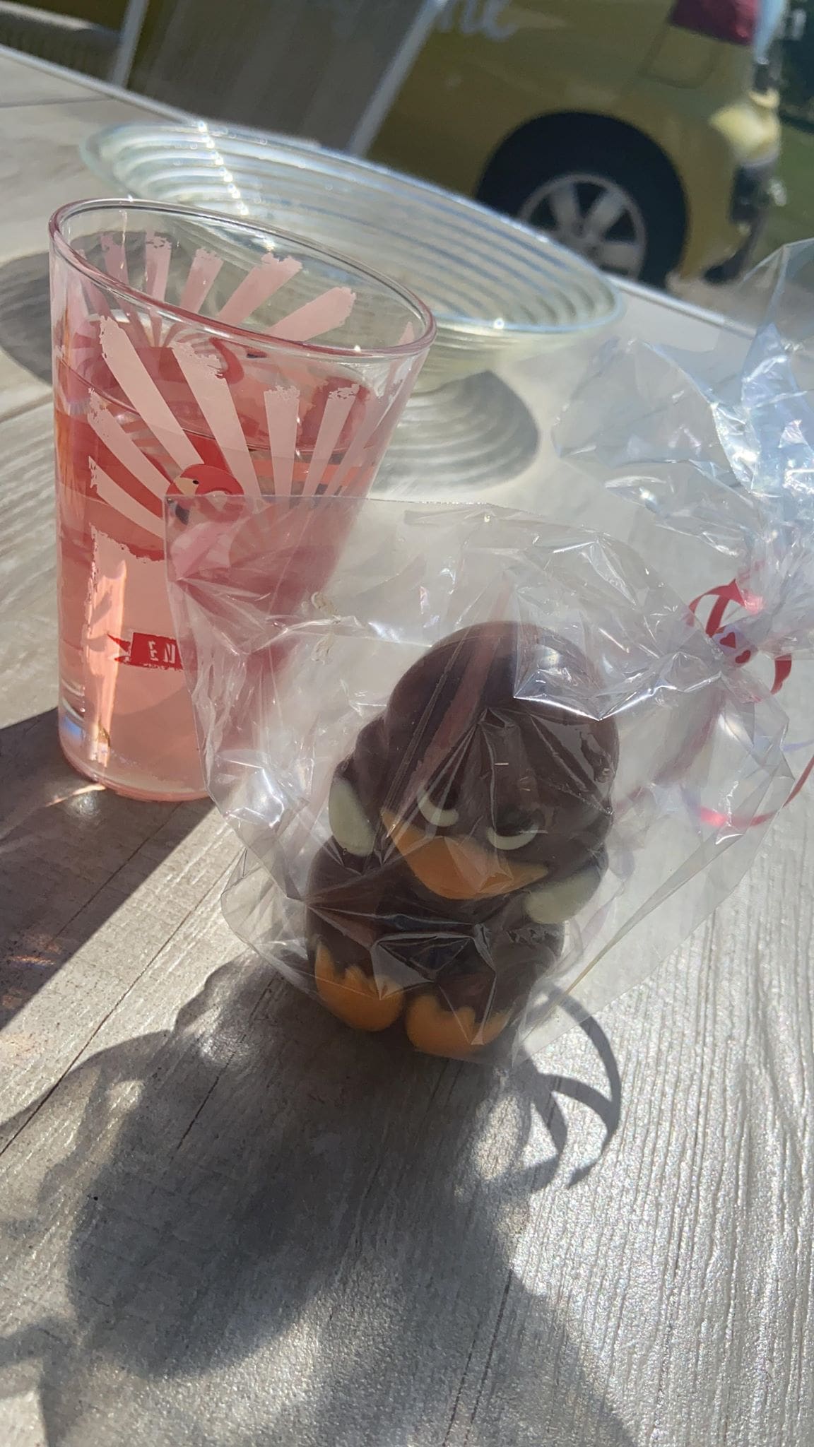 Met vaders even wat drinken. Dit paaskuiken stond nog in huis. Ach: anders gaat dat ding nooit op dachten we…