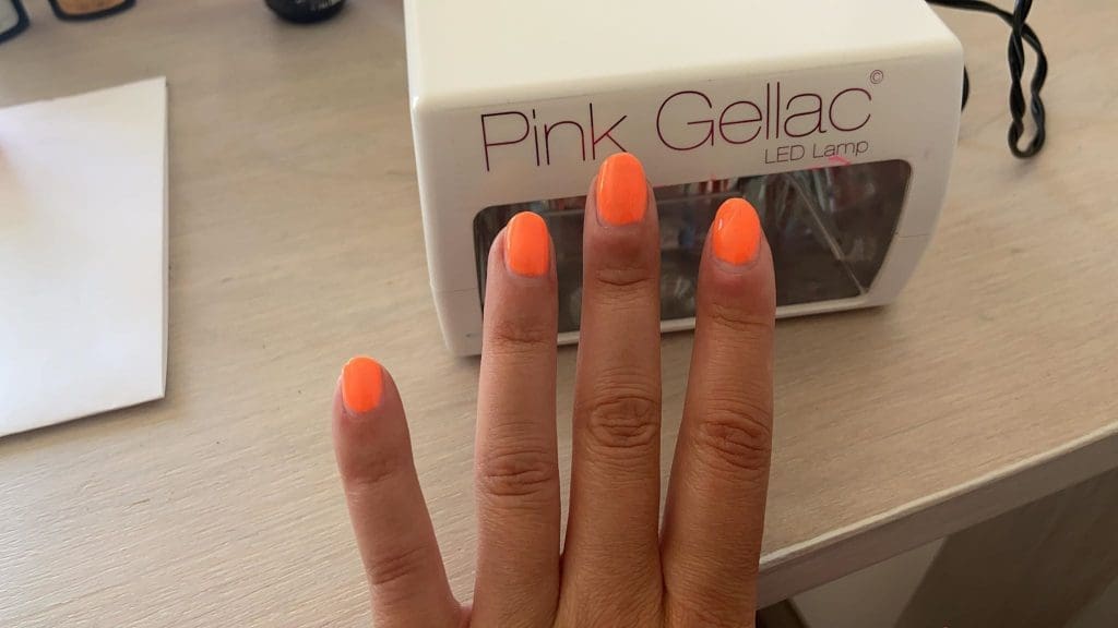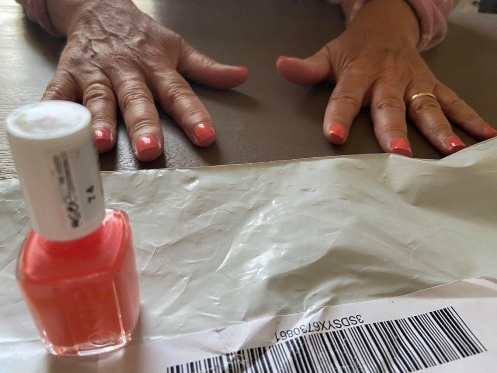 De nagels van mijn moeder heb ik in een vrolijk kleurtje gelakt. Nagelstudio at home.
