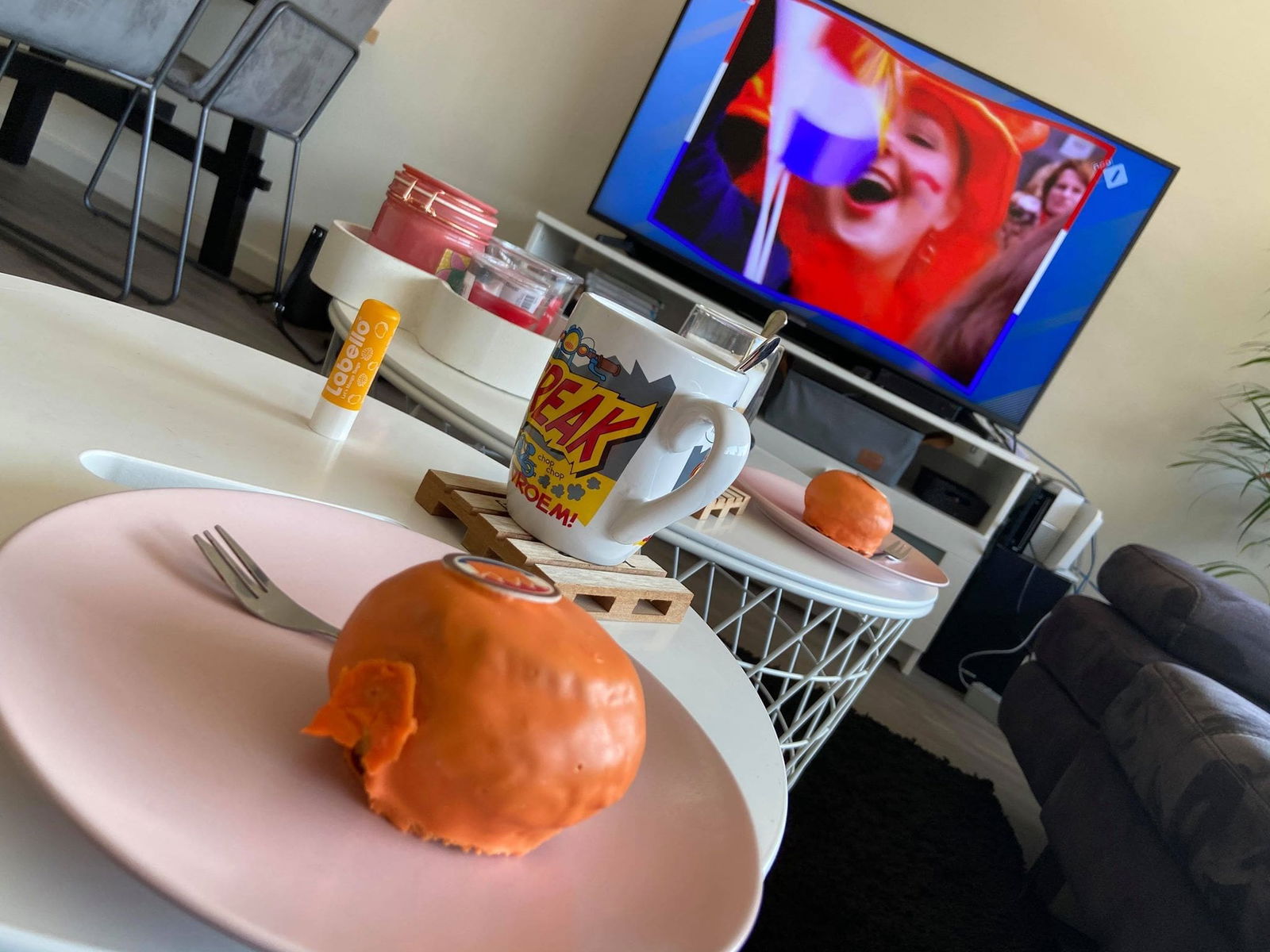En lekkere Jumbo oranje bollen. En oude fragmenten van voorgaande jaren Koningsdag kijken op de tv.