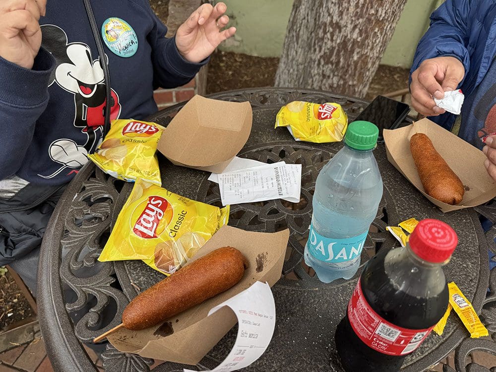 We hadden trek gekregen en haalden een corndog. Je krijgt hier chips en drinken bij.