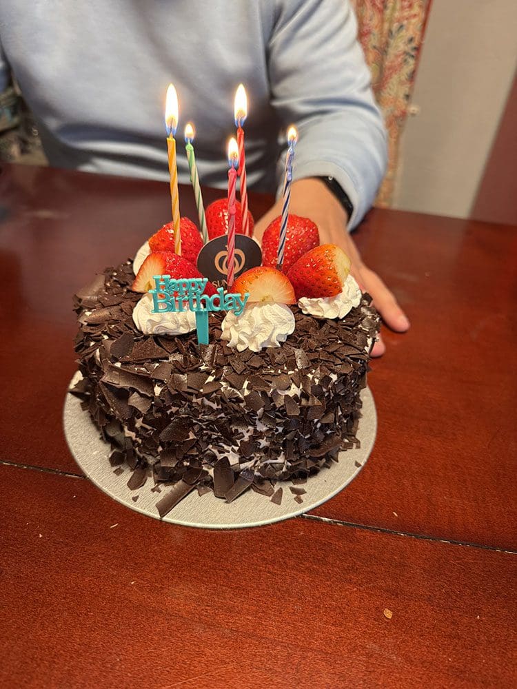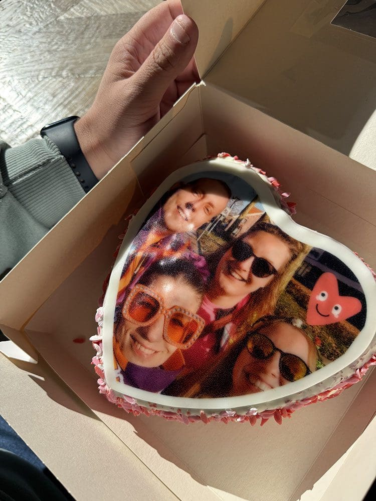 Ik ging met Joey mee het eten ophalen. Om daarna stiekem een taartje voor Thijs te halen.