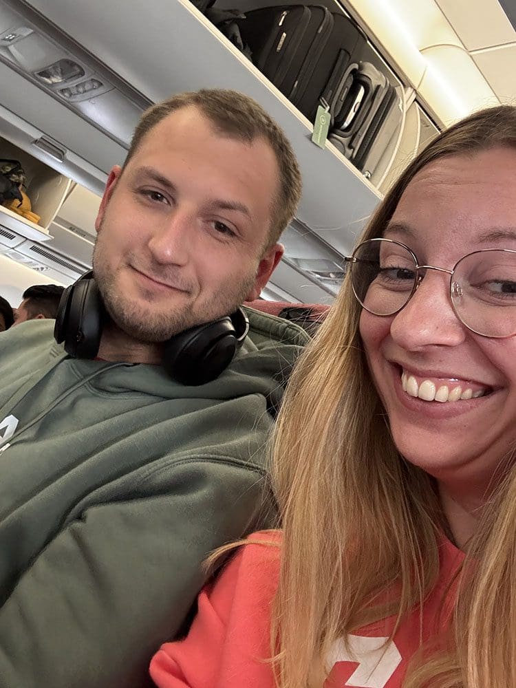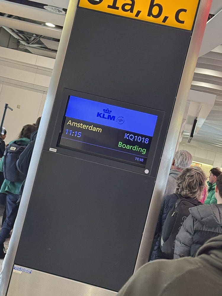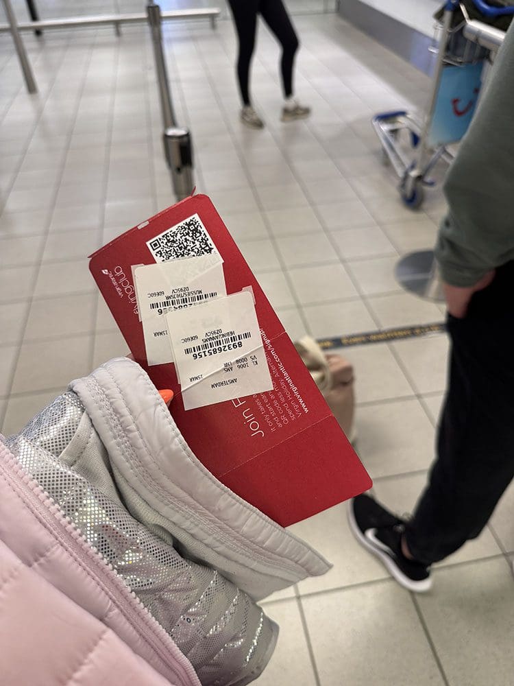Bij de douane mochten we gelukkig door en daar zagen we dat de vlucht wat vertraagd was omdat ze niet alle passagiers nog hadden. We hebben het gered!