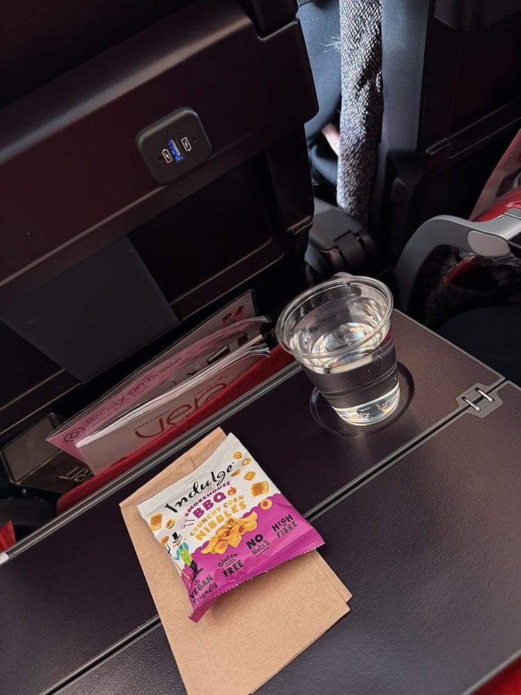 Het eten was bij deze maatschappij wat karig vonden wij. Kregen geen flesje water. Maar van die kleine bekertjes drinken. Jammer.